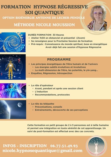 Découvrez la formation en hypnose régressive quantique et télépathie de Nicole Moussion. Personnalisez votre apprentissage avec des options en énergétique et inscrivez-vous dès maintenant pour transformer votre vie et développer votre potentiel!