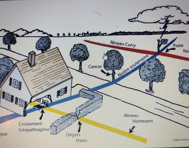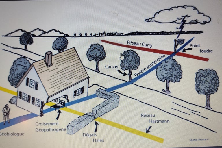 · d’établir toutes les nocivités du lieu : vortex, nœuds pathogènes, cheminée cosmo-tellurique, eau souterraine, failles, points foudre, mémoires, métaux, pollutions, présences…