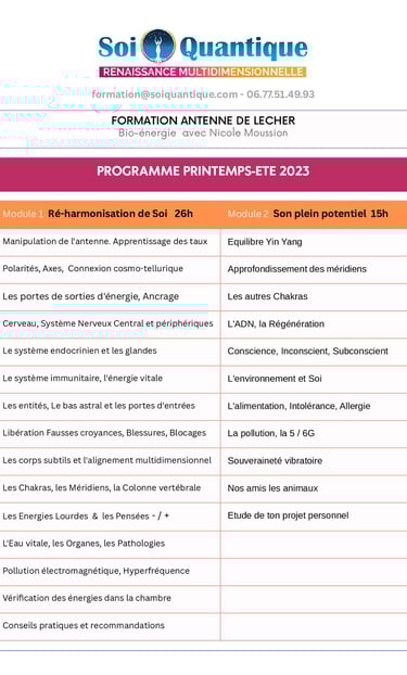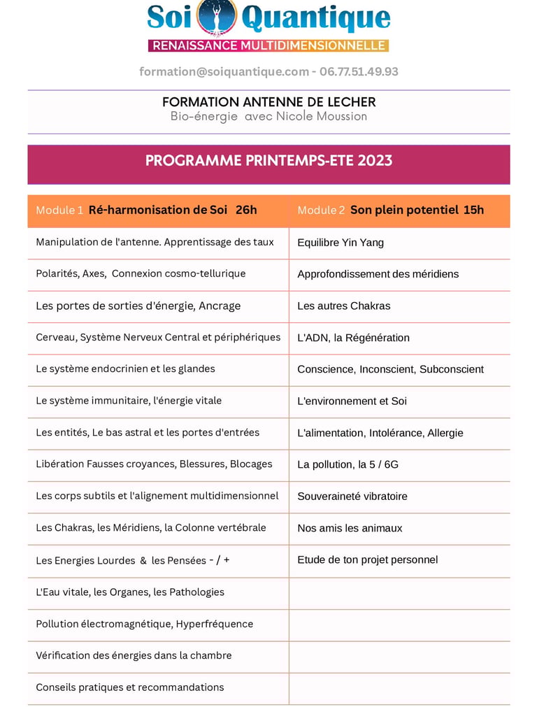 Vous bénéficiez d’un soin approfondi énergétique et quantique tout en apprenant. Vous étudiez votre Être, le libérer et le réharmoniser en ramenant ses énergies à la norme avec l’antenne de Lecher.
